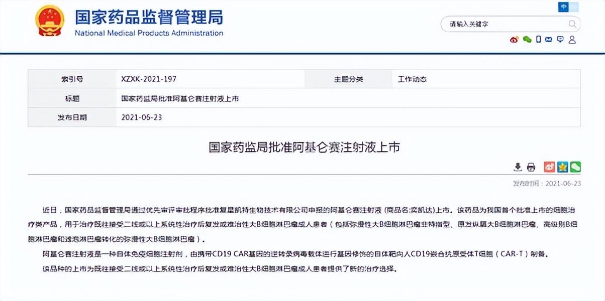 戴阿姨成为2021年6月我国首个获批上市CAR-T药品的深圳首位应用者,且在治疗后病情得到了完全缓解。